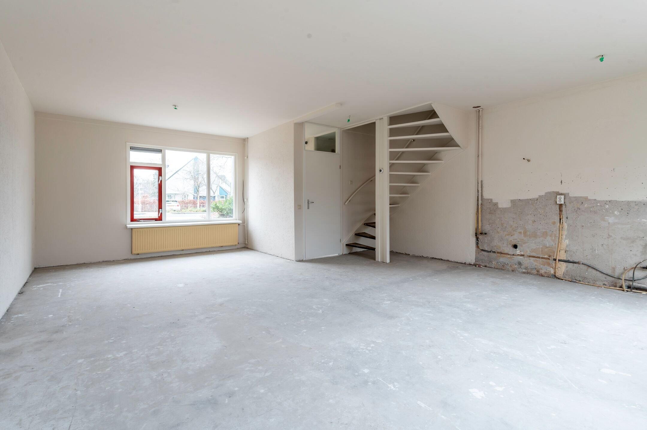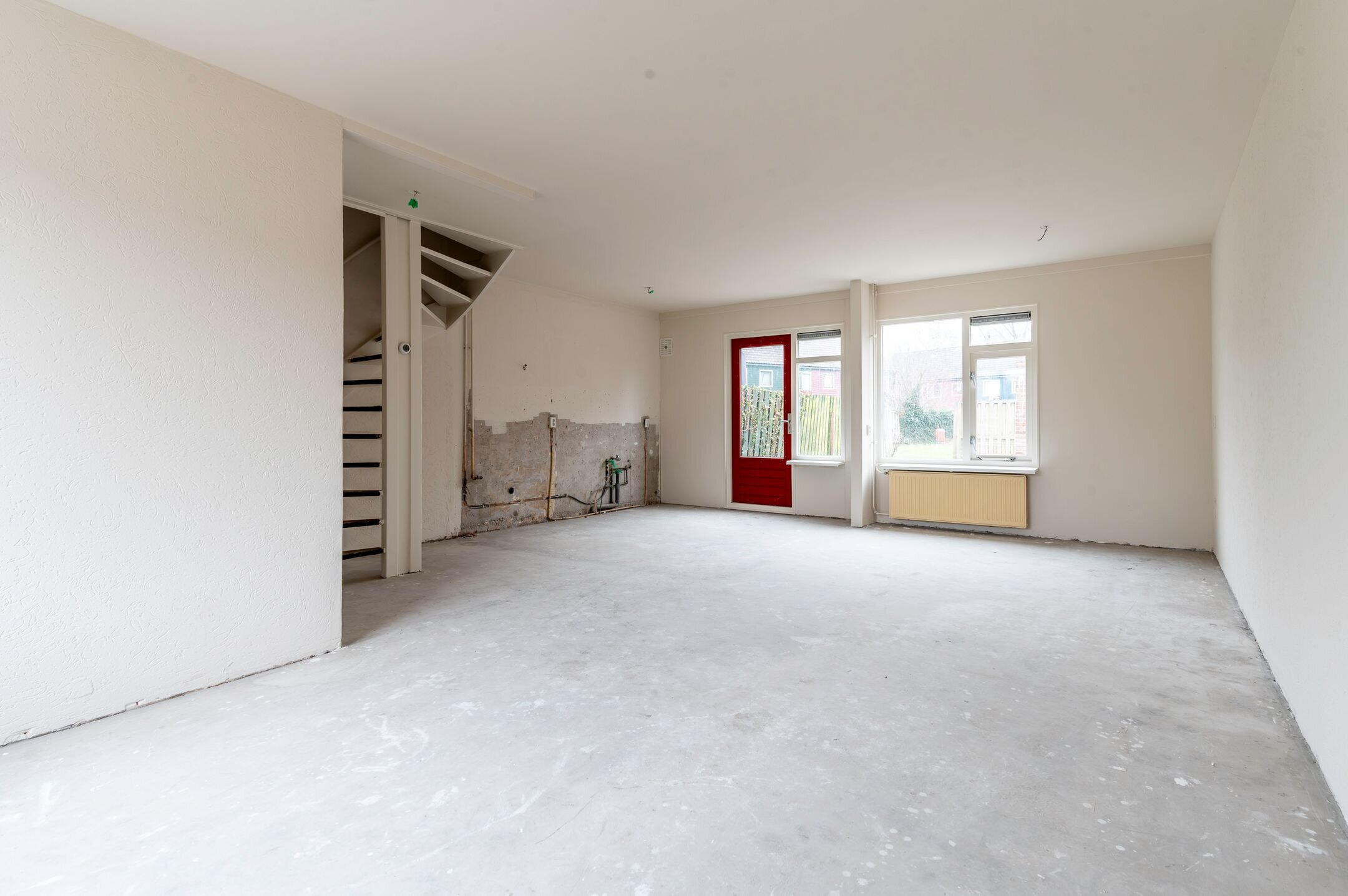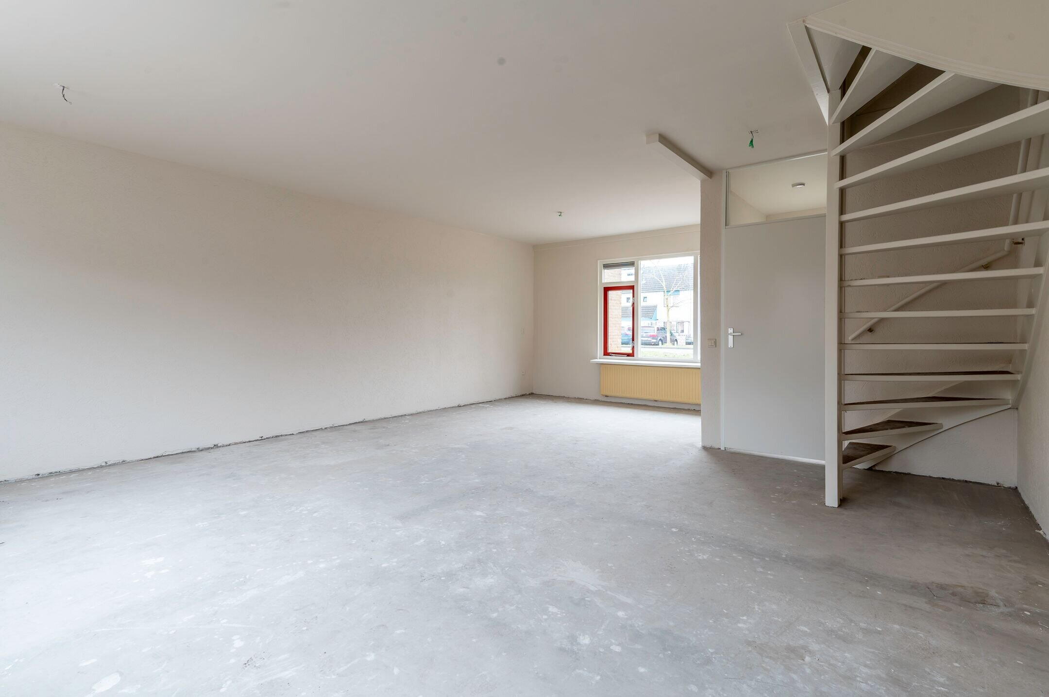 Begane grond: Entree; hal met meterkast, toilet met fonteintje en toegang tot de woonkamer en keuken alsmede de trapopgang naar de verdieping; aan de voorzijde gesitueerde woonkamer van ongeveer 26m²; de woning wordt verkocht zonder keuken, waardoor de koper de mogelijkheid heeft om geheel naar eigen smaak een keuken te plaatsen.