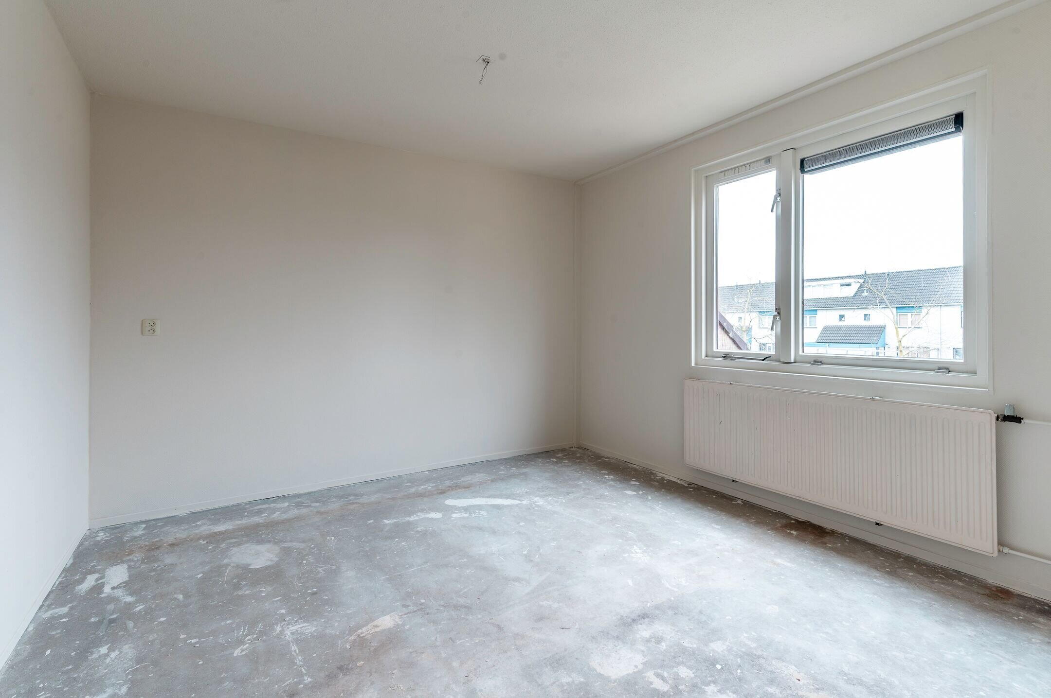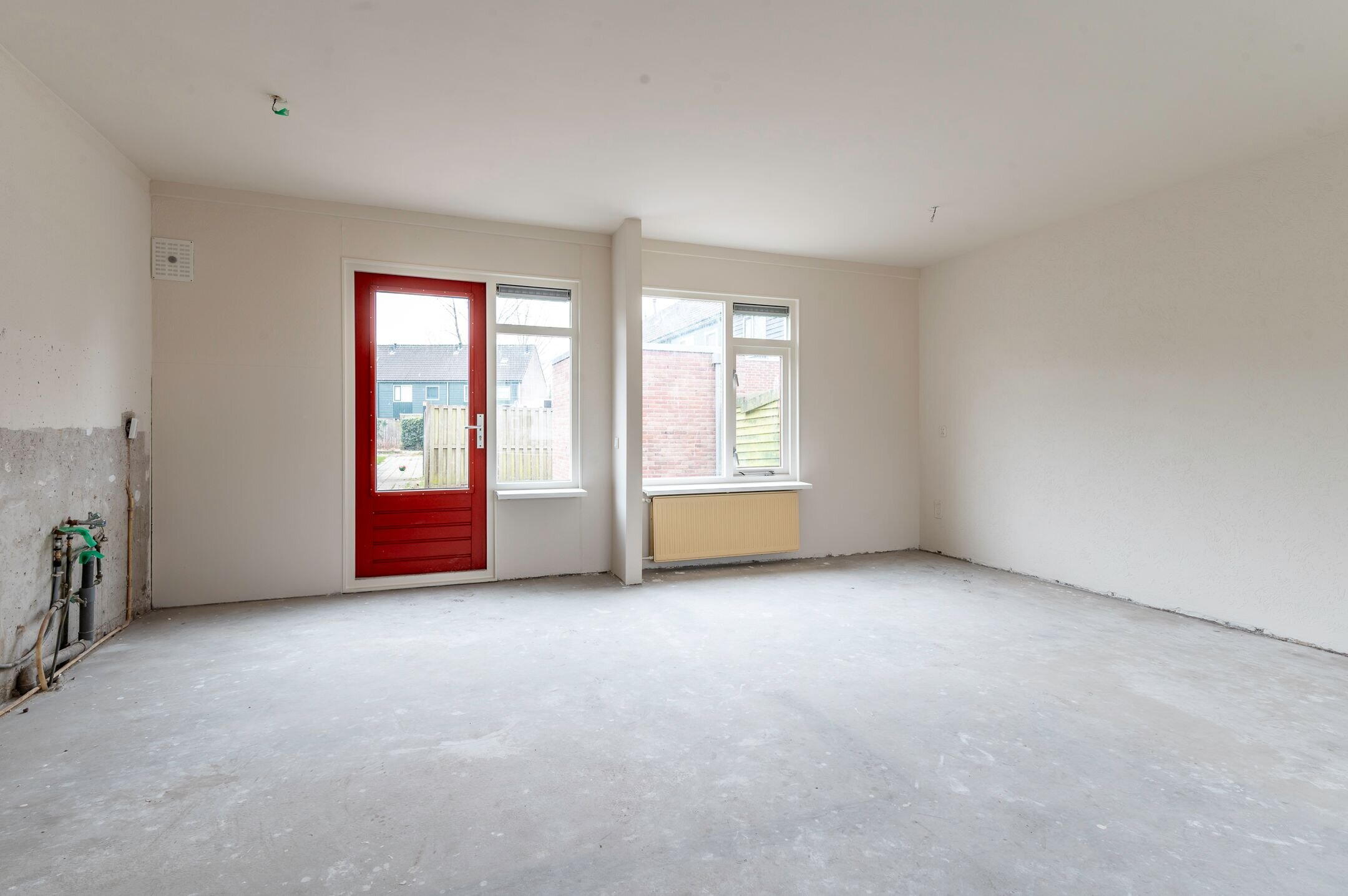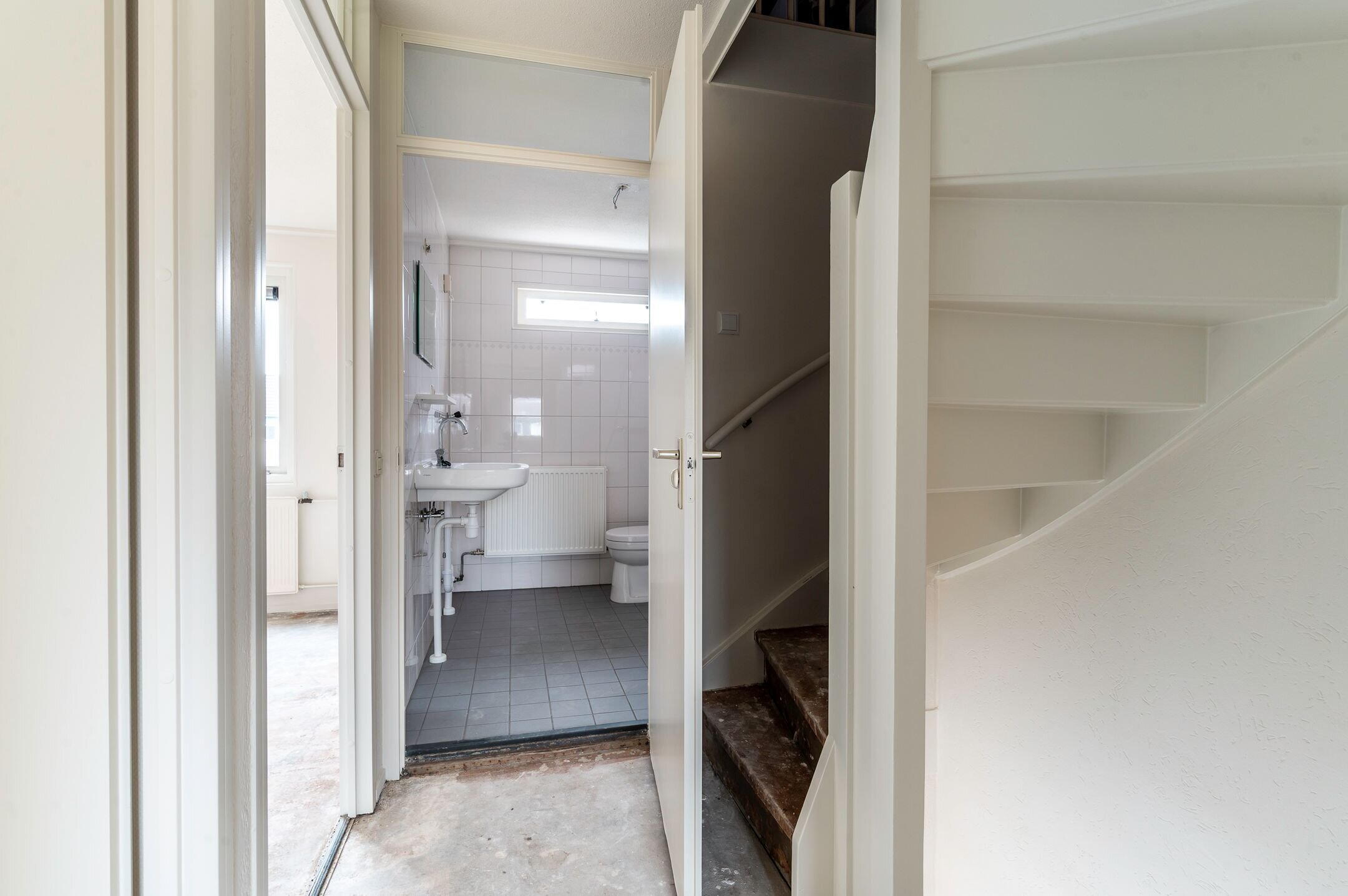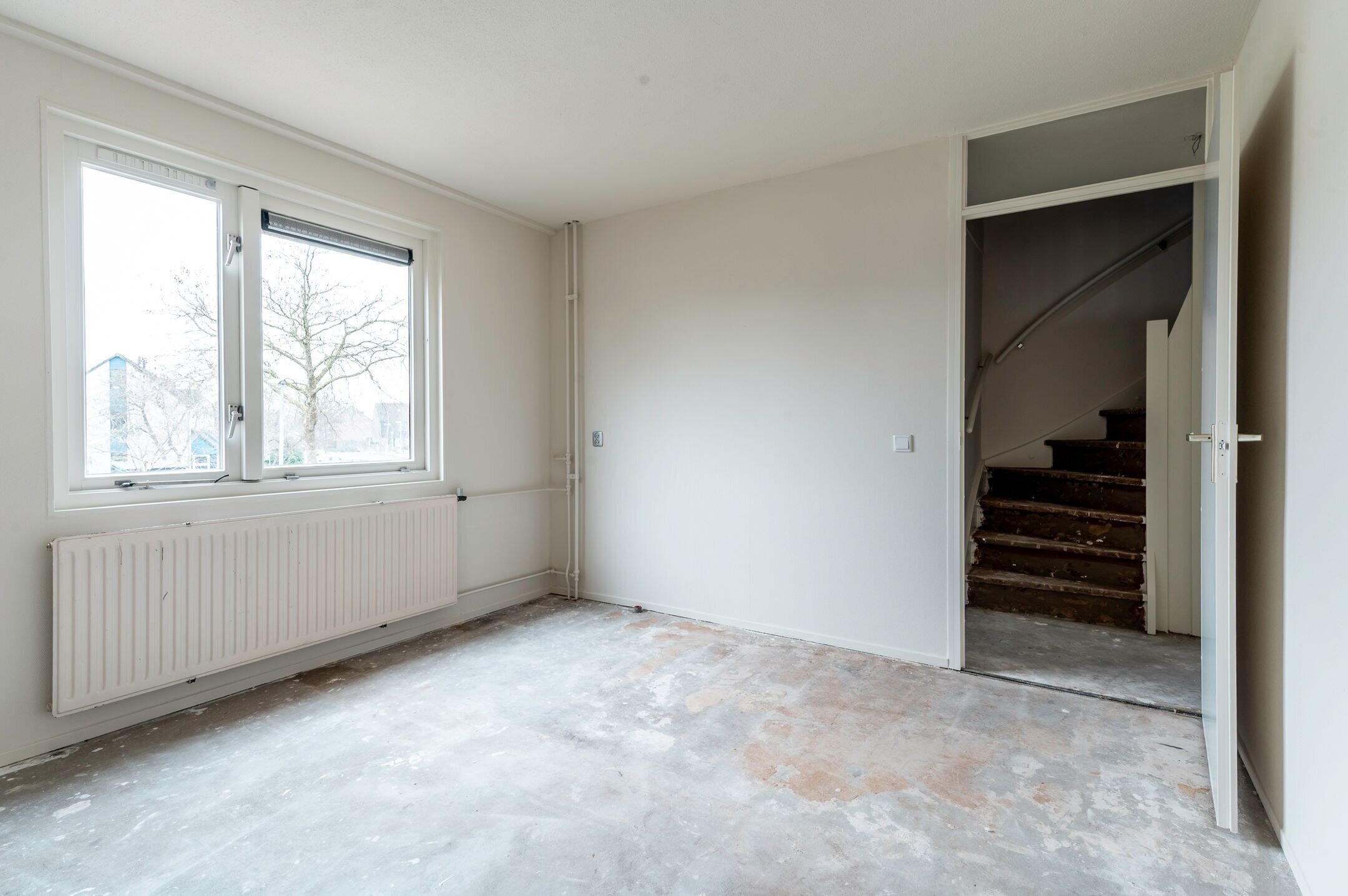 Begane grond: Entree; hal met meterkast, toilet met fonteintje en toegang tot de woonkamer en keuken alsmede de trapopgang naar de verdieping; aan de voorzijde gesitueerde woonkamer van ongeveer 26m²; de woning wordt verkocht zonder keuken, waardoor de koper de mogelijkheid heeft om geheel naar eigen smaak een keuken te plaatsen.